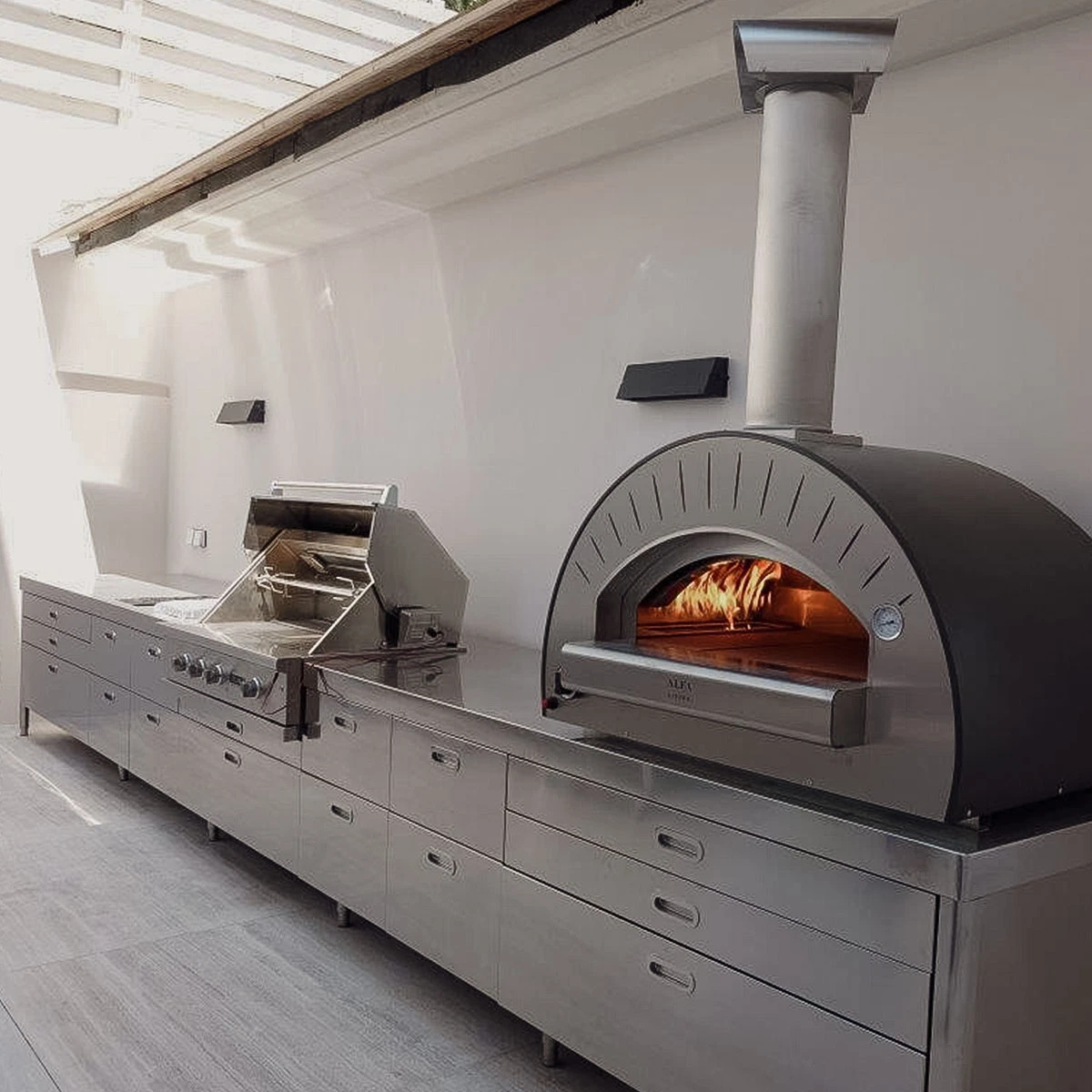 Zum Aufrüsten der Außenküche eignet sich der Alfa Forni Dolce Vita – der größte Gas-Ofen der Alfa-Serie, der auch mit Holz befeuert werden kann. Durch seinen klassischen und soliden Stil und klare Linien im Design eignet sich der vor allem zum Aufstellen auf einer Arbeitsplatte. So fügt er sich nahtlos in den Rest der Outdoorküche ein und verpasst ihr ein zusätzliches Extra.