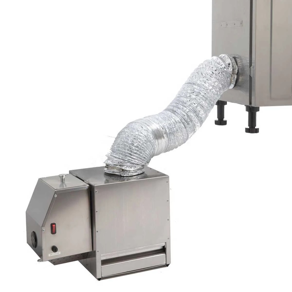 Für den Betrieb des Adapters wird der Rauchgenerator vom Räucherofen abgenommen und in den Adapter eingehängt. Anschließend wird er mit der Räucherkammer durch ein flexibles Rohr verbunden, durch den der Rauch hinein geleitet wird. Die Länge der Rauchzuleitung sollte zwischen 1,2-2 m betragen.