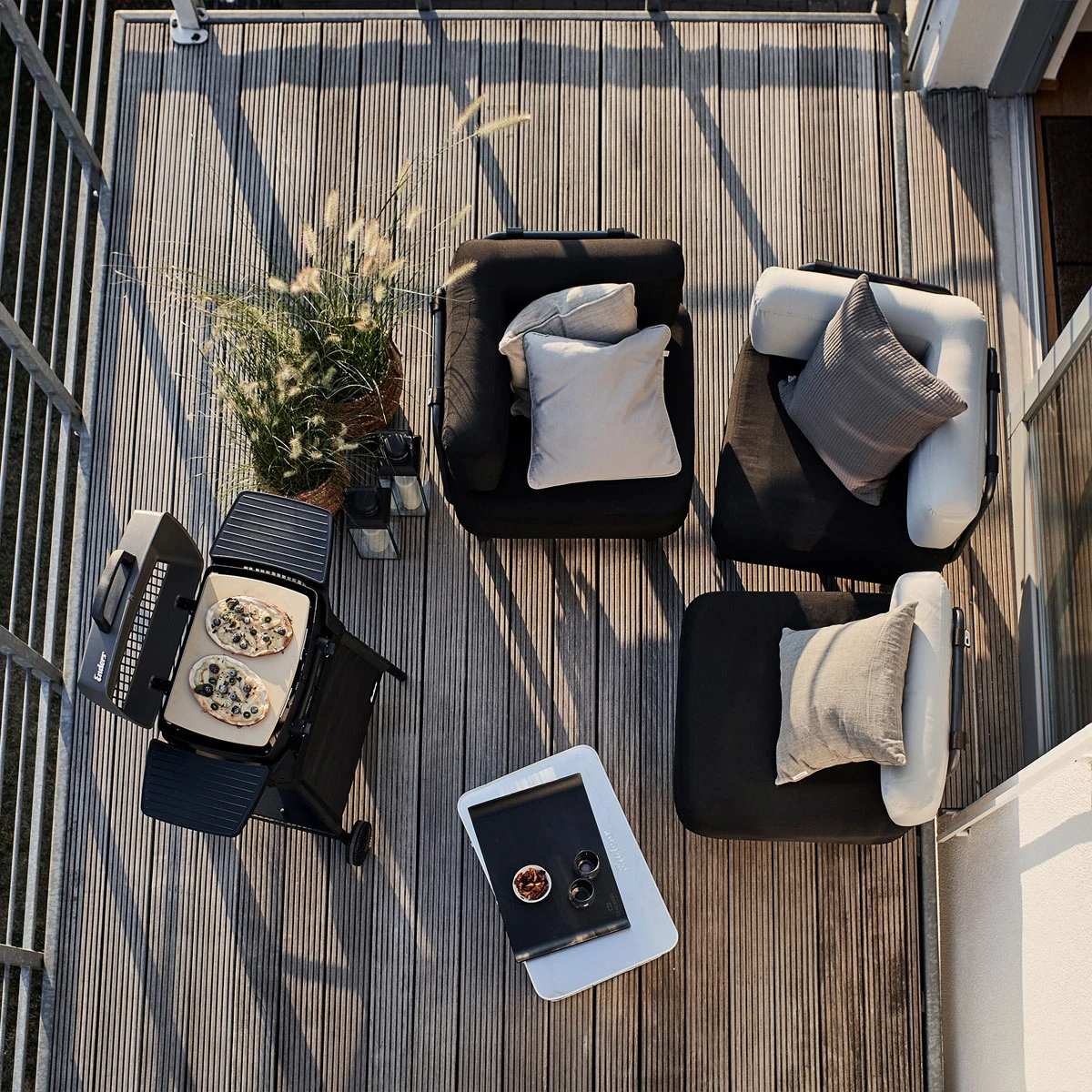 Auf dem lässt es sich dabei ganz komfortabel und in angenehmer Arbeitshöhe grillen. Mit dem cleveren Schiebesystem ist der tragbare Grill ganz einfach, schnell und sicher mit dem Trolley verbunden und wieder getrennt.