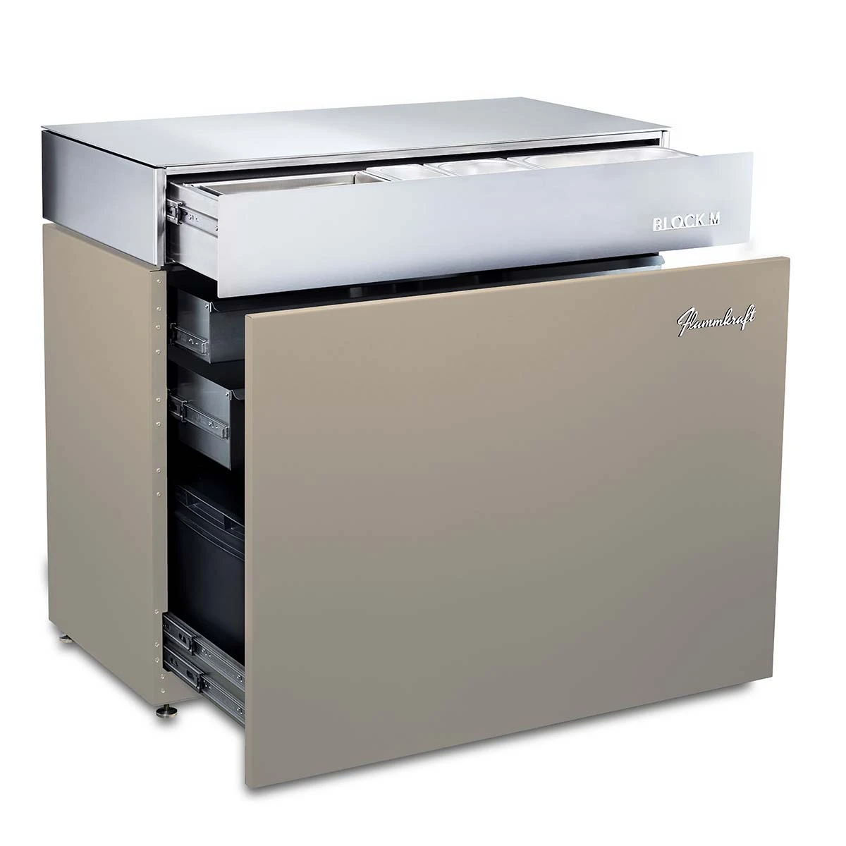 Der Block M ist ein aus 100% Edelstahl, in der Grundfläche entspricht er dem Block D und ist in den gleichen Farben erhältlich. Neben umfangreichen für Zubehör bietet der Block M einen Abfallbehälter und eine komfortable Lösung für die Vorbereitung und Bereitstellung von Zutaten.