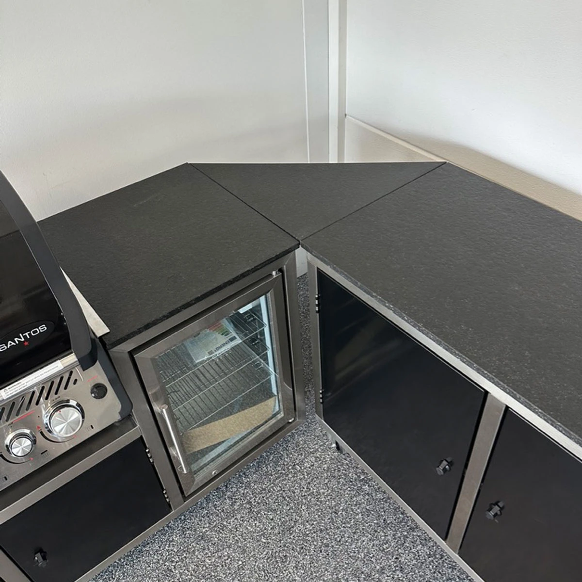 Die Blackline Serie bietet verschiedene Module für Gas- und Keramikgrills, für Kühlschränke sowie für Arbeitsfläche und Stauraum. Mit dem könnt Ihr einzelne Module im rechten Winkel zu einer verbinden.