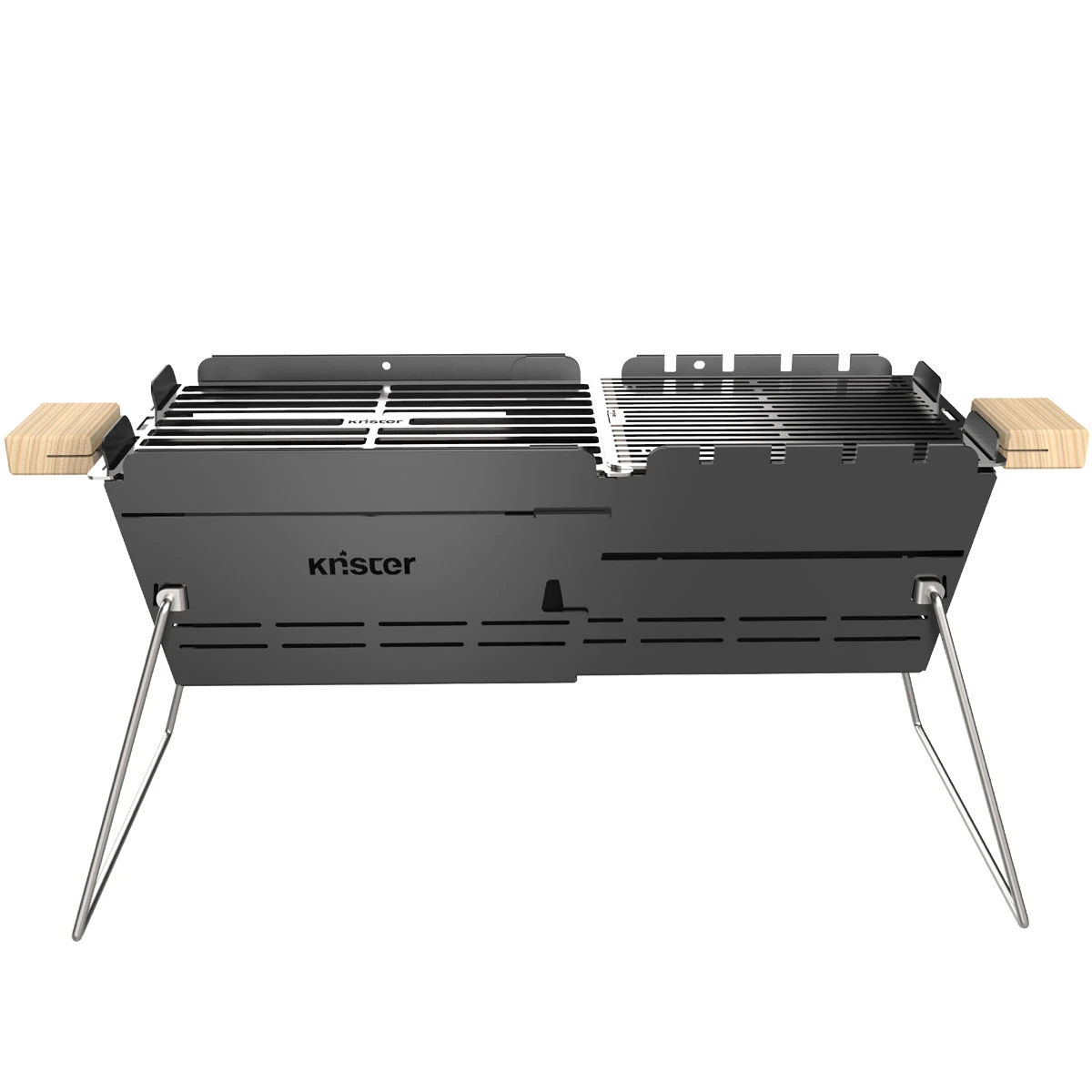 Beide Grillroste lassen sich nebeneinander nutzen oder in verschiedenen Höhen, so habt Ihr sogar die Möglichkeit . Der zweite Grillrost hat dichtere Streben und eignet sich besonders gut für kleinteiliges Grillgut wie Garnelen, Nürnberger und geschnittenes Gemüse. - : Zuerst zieht Ihr die beiden Korpusteile auseinander, dann klappt Ihr die Tragebügel nach unten um, bis sie hörbar einrasten. So hat der Knister auf jedem Untergrund einen soliden Stand.