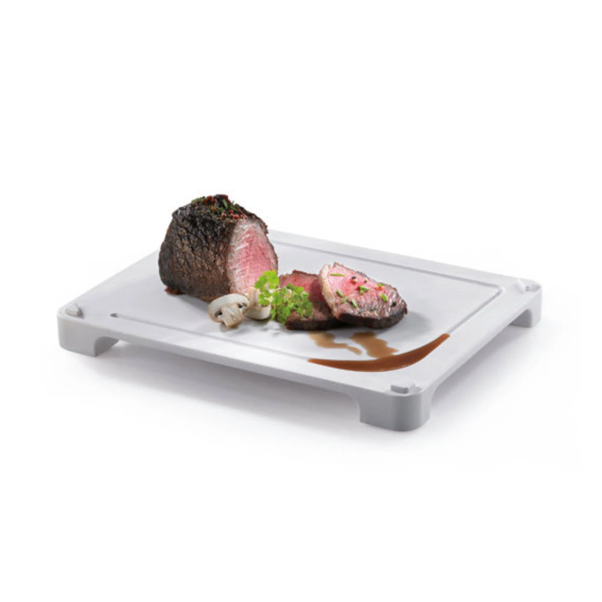 Im Basisbrett befindet sich eine Saftrille, so bleibt die Arbeitsplatte sauber. Für einen stabilen Stand sorgen die gummierten Standfüße. Sie verhindern, dass das Schneidebrett VarioBoard versehentlich verrutscht.