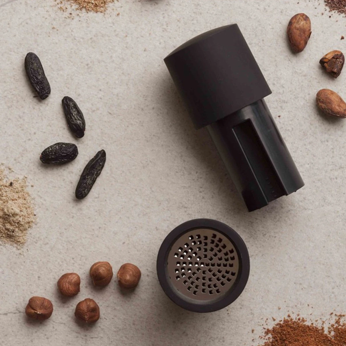 Die schwarze Muskatmühle enthält ein praktisches, luftdichtes Fach zum Aufbewahren der Gewürze.