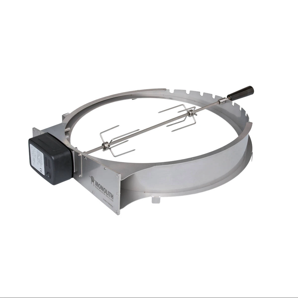 Drehspieß Set für Euren Monolith Keramikgril LeChef. Der Ring des Drehspieß hat Aussparungen für die passenden Spieße von Monolith.