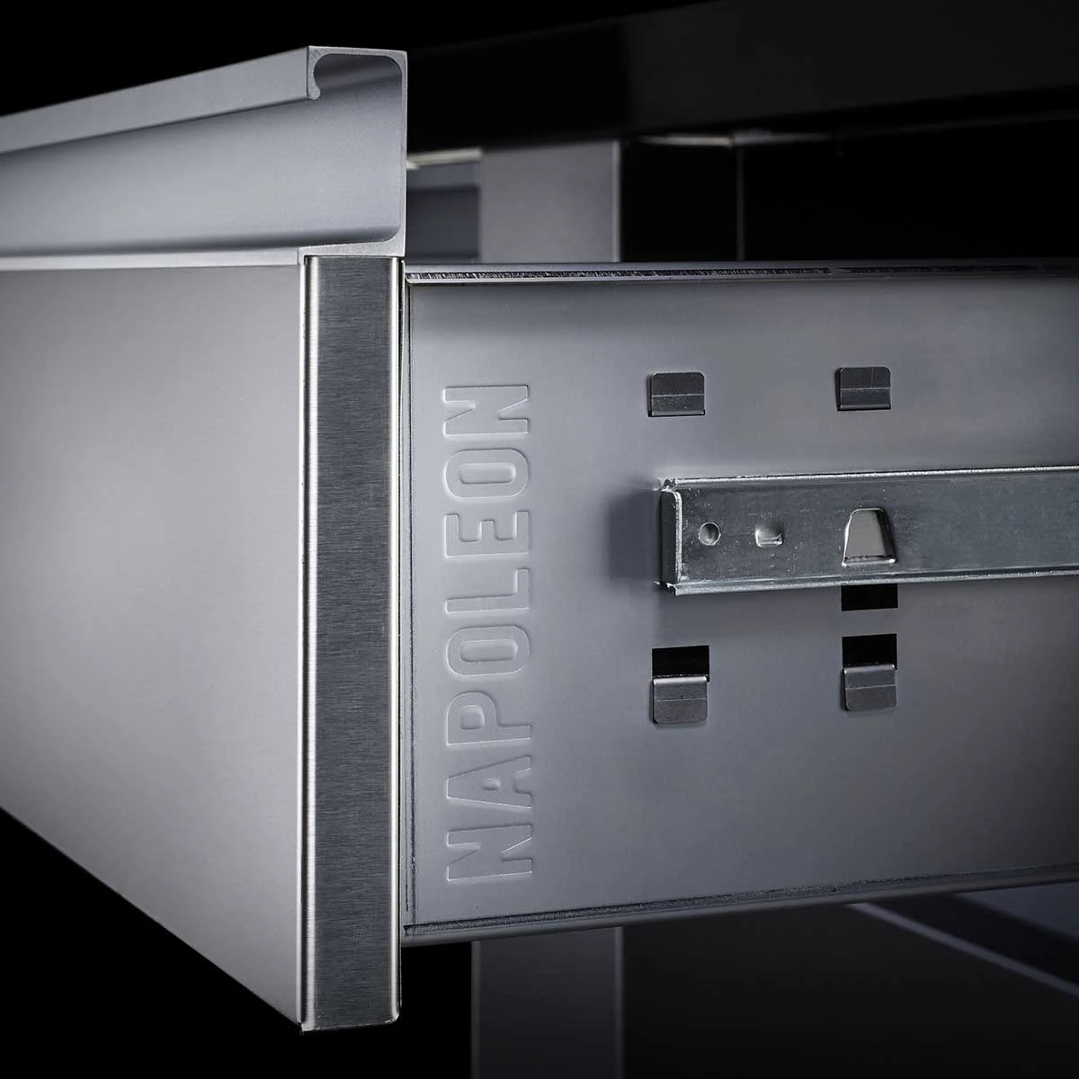 Alles untergebracht mit der Universallösung von Napoleon. Links genügend Platz für z.B. die Gasflasche, rechts eine kleine und eine Große Schublade als Staumöglichkeit für alle Grillutensilien. Die Schubladen und die Türe sind mit dem Softclose-Funktion ausgestattet.