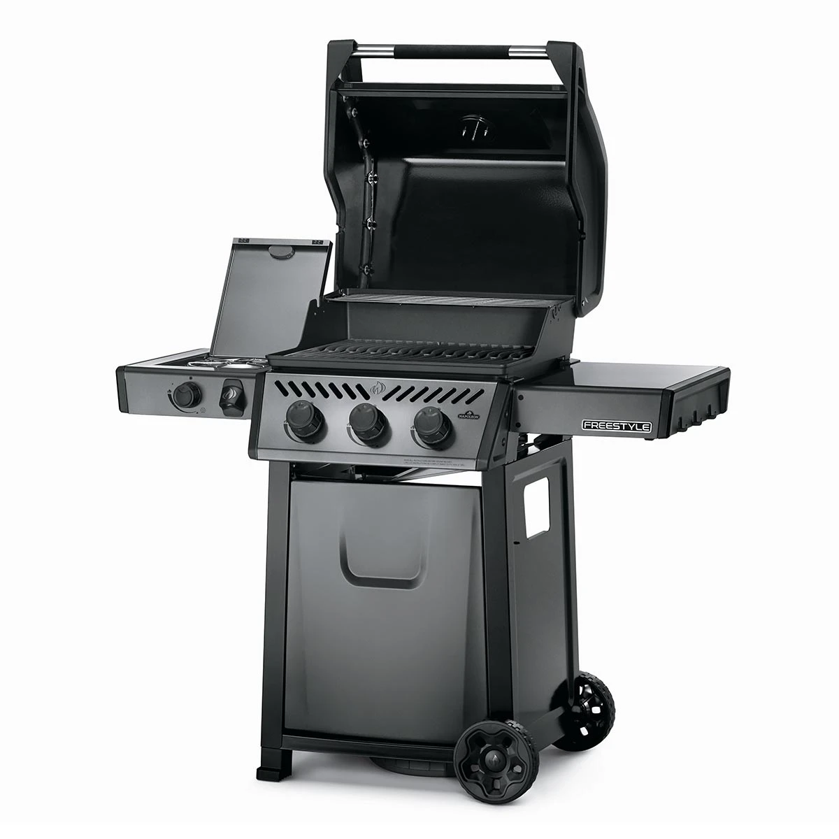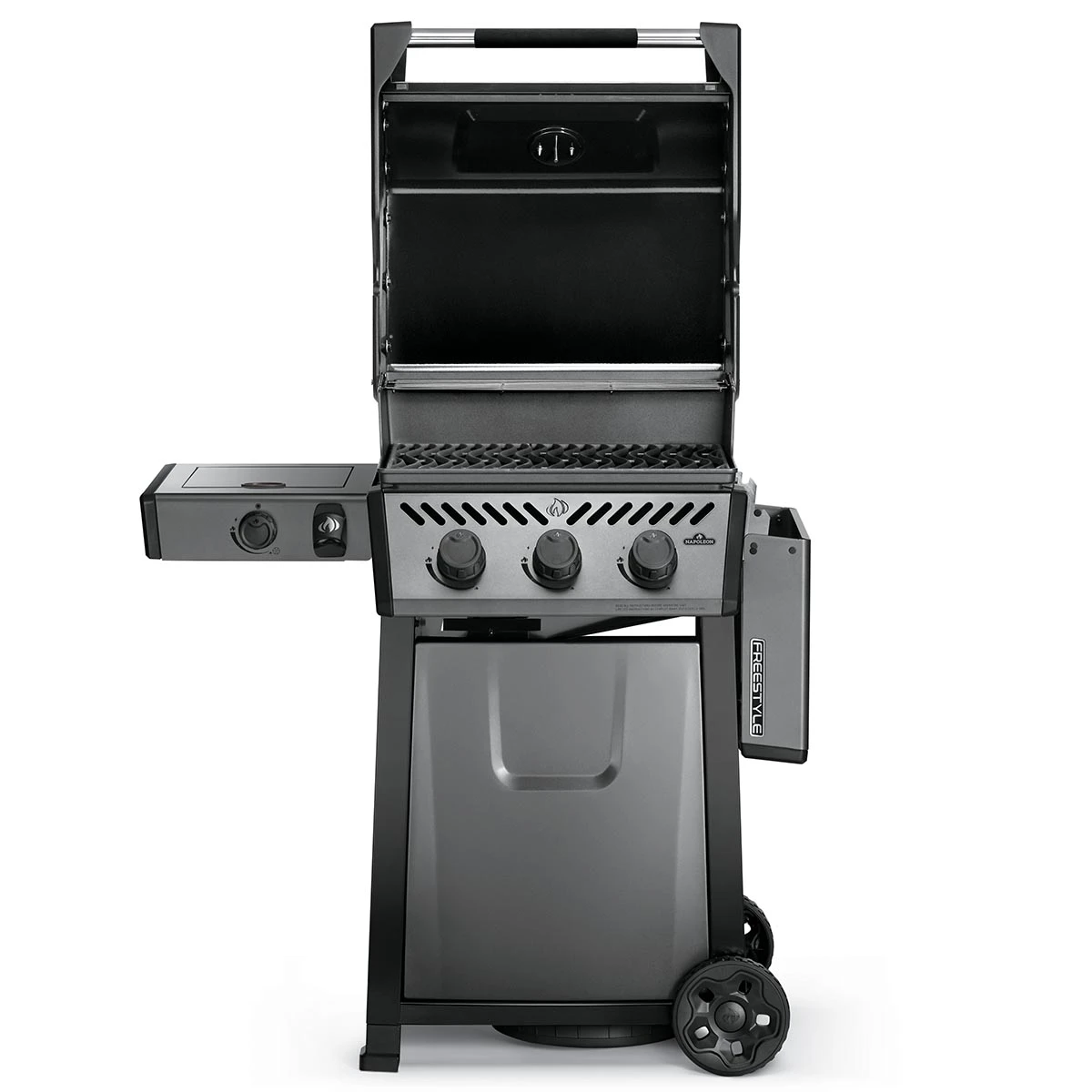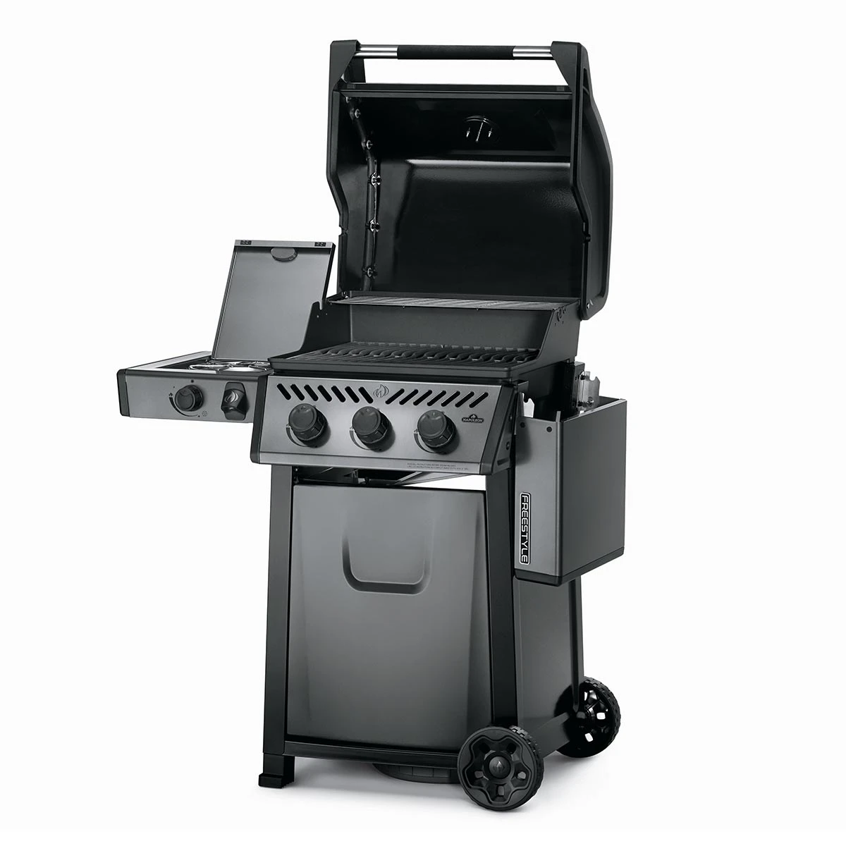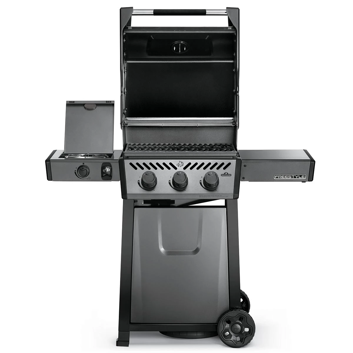 Mit dem abklappbaren Seitentisch rechts ist der Napoleon Freestyle äußerst kompakt und lässt sich auch bei kleinstem Platzangebot unterbringen.