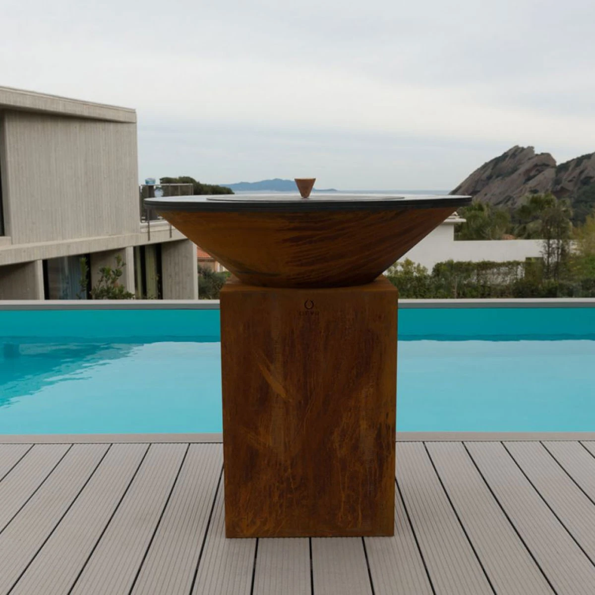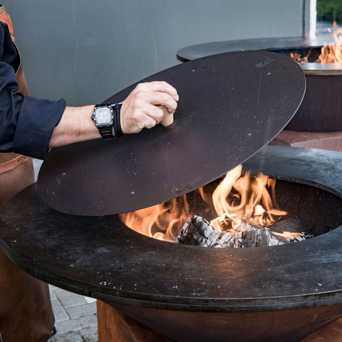 Der Deckel hat einen Durchmesser von 60 cm und deckt damit die Öffnung der OFYR Feuerplatte 100 perfekt und dicht ab. Er ist mit versehen, damit er beim Löschen der Flamme nicht verrutscht. Der ist ein formschöner Blickfang und ergänzt das Design perfekt.