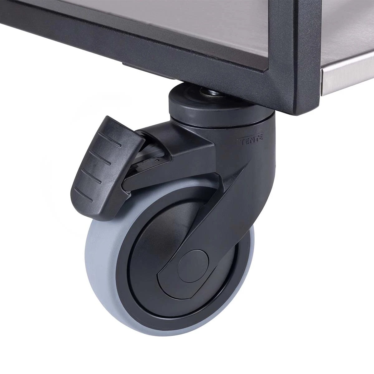 - Lenkrollen: mit Feststeller, Lauffläche aus Gummi, Präzisionskugellager. Tragfähigkeit 100 kg/ Rolle