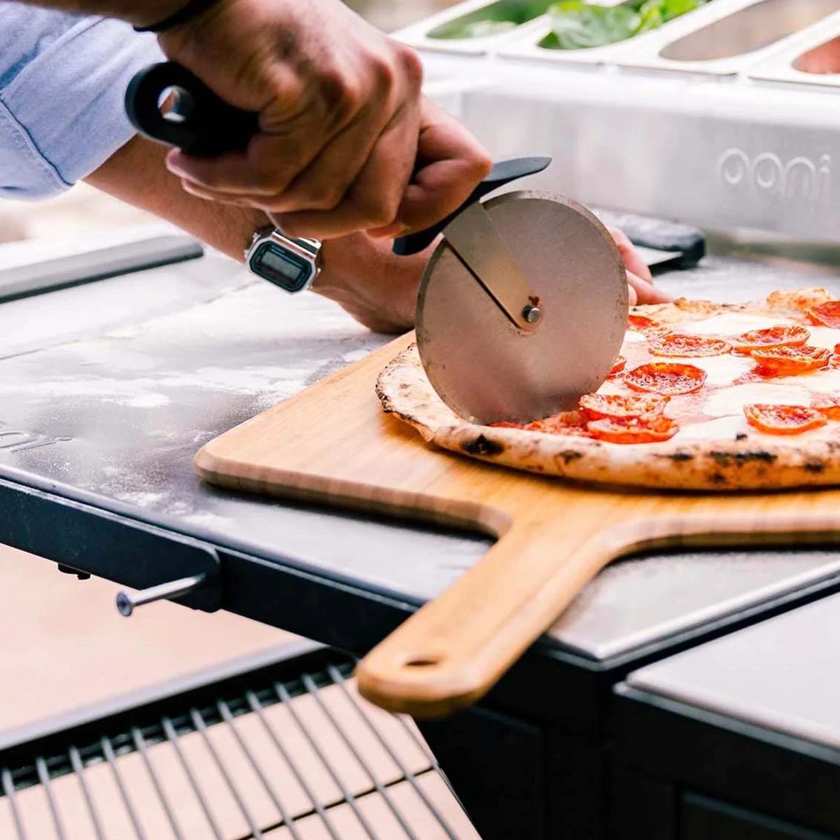 Der Ooni Pizzaroller ist spülmaschinenfest, es sollten jedoch keine scheuernden Reinigungsmittel verwendet werden. Achtung: Von Kindern sollte man ihn unbedingt fernhalten, da die Klinge extrem scharf ist.