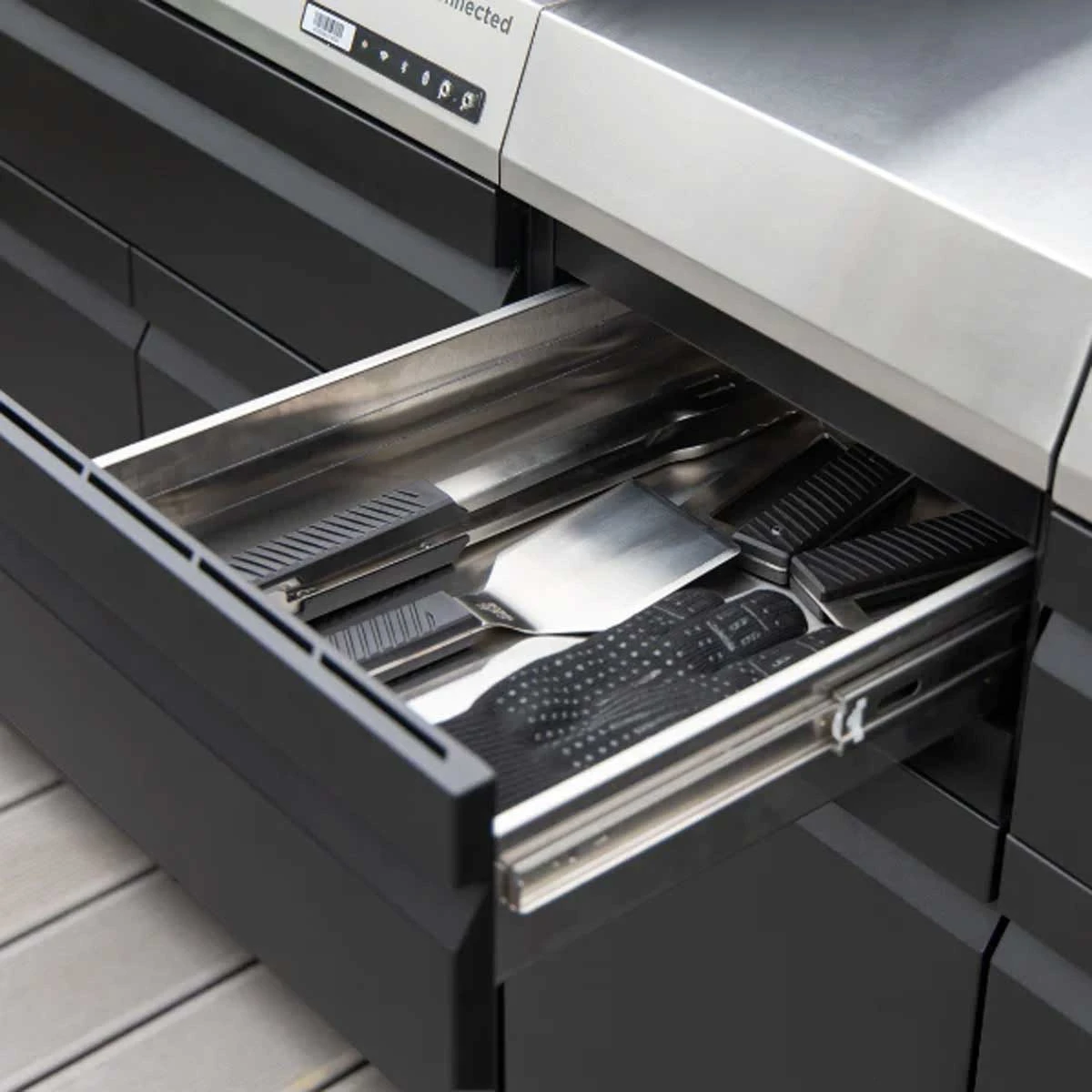 Der schmale Schrank bietet Platz und Arbeitsfläche auch auf kleiner Stellfläche: Das 41 cm breite Schrankmodul lässt sich vielseitig nutzen und dient Euch als Stauraum, Ablage und Arbeitsplatte. Der Schrank beherbergt Grillzubehör, Zutaten, Kräuter und Gewürze griffbereit, während Ihr auf der robusten Arbeitsfläche aus Edelstahl das Grillgut vorbereitet und anrichtet. Für eine besonders komfortable Handhabung sorgt die SoftCloseTechnik an Tür und Schubladen, die sich sanft und geräuscharm schließen lassen.