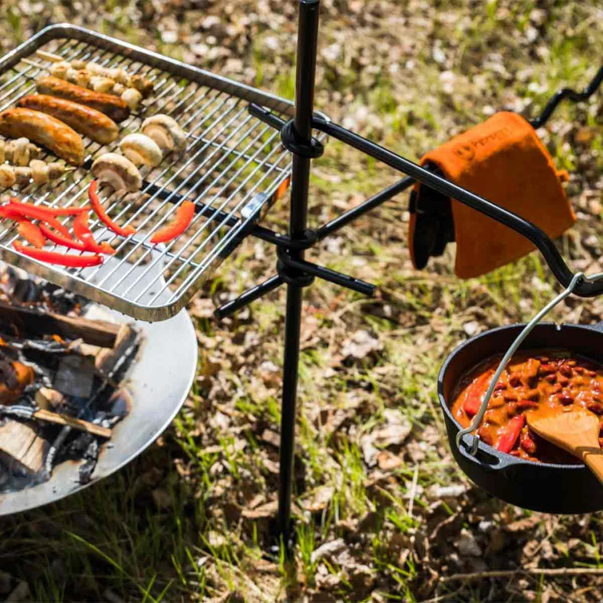 Hier findet ein Dutch Oven (bis ft6) oder ein Wasserkessel neben dem Grillrost seinen Platz, auf dem Würstchen, Spieße, Gemüse und Co knusprig gegrillt werden. Bei höherem Abstand eignet sich der Grillrostarm auch w