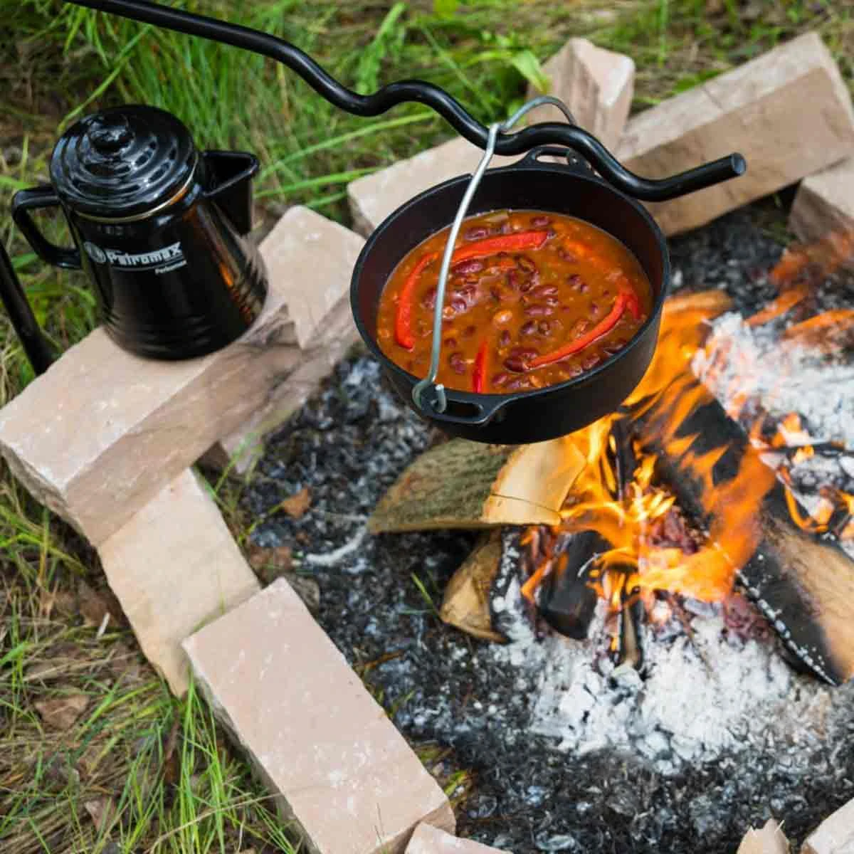 Hier findet ein Dutch Oven (bis ft6) oder ein Wasserkessel neben dem Grillrost seinen Platz, auf dem Würstchen, Spieße, Gemüse und Co knusprig gegrillt werden. Bei höherem Abstand eignet sich der Grillrostarm auch wunderbar zum Warmhalten.