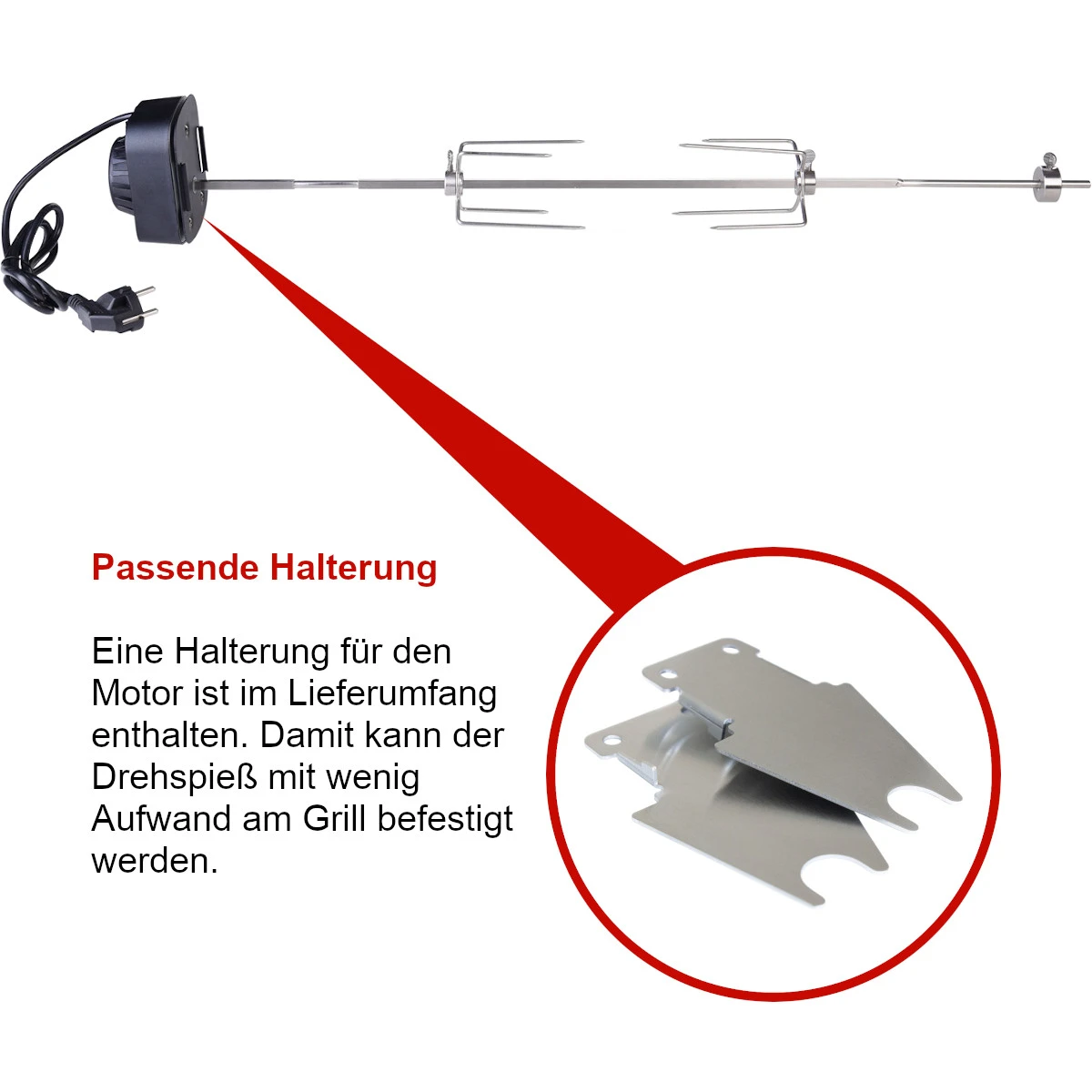 Ein strombetriebener Drehspieß grillt fast von alleine. Einfach zurücklehnen und den Drehspieß die Arbeit machen lassen.