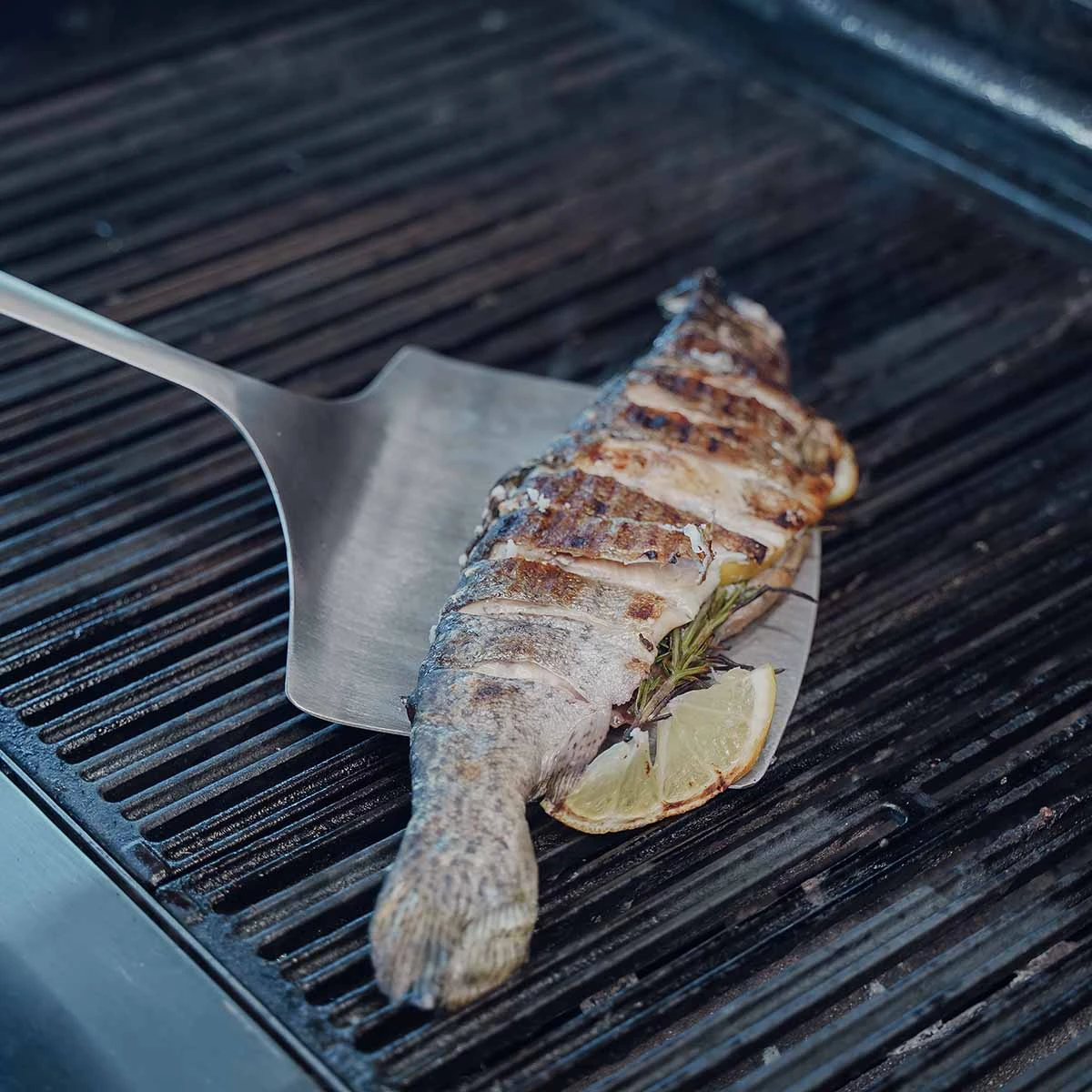 Mit dem extra breiten Spatel wendet Ihr ab jetzt problemlos Fischfilets, ganze Fische und selbst große Fleischstücke. Auch Burgerpatties und Grillkäse könnt Ihr mit dem SANTOS Fischwender mühelos und absturzsicher anheben, drehen und servieren. Durch die Gummierung am Griff liegt der Wender sicher und rutschfest in der Hand. Zum griffbereiten Ablegen und einfachen Verstauen befindet sich am Griff eine Aufhängeöse. Leichte Reinigung dank Edelstahl.