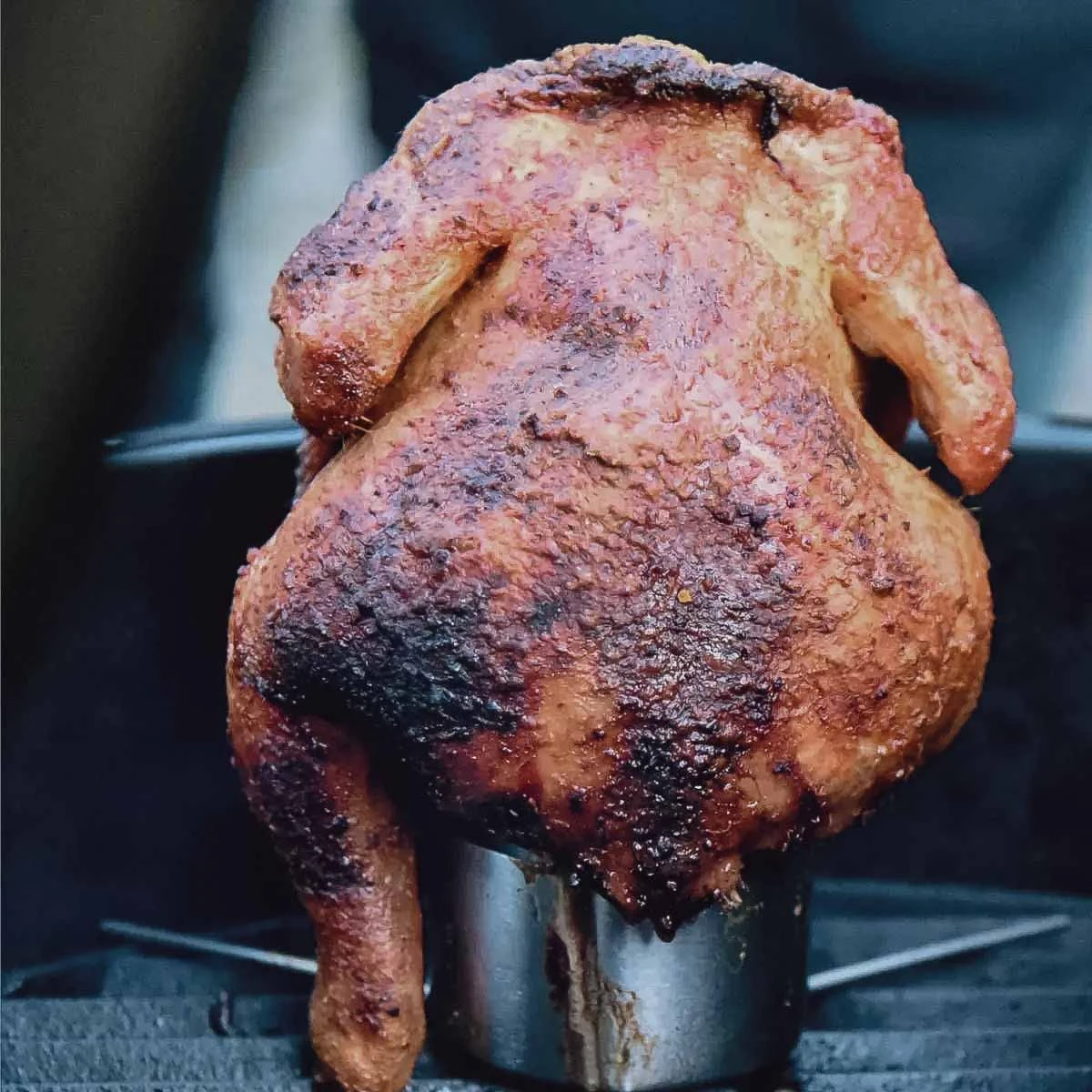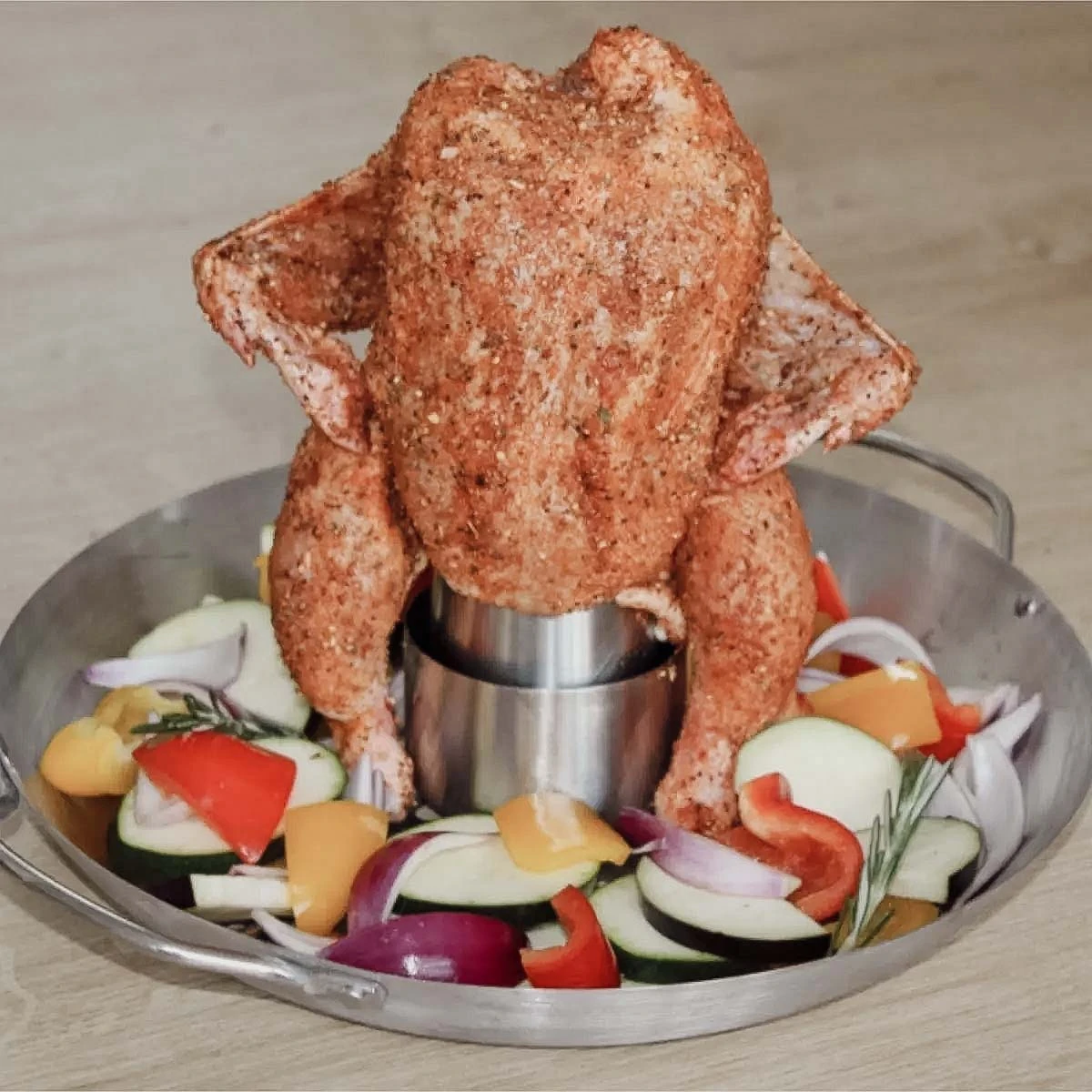 Der SANTOS Hähnchen-Griller aus Edelstahl eignet sich hervorragend zum Grillen und Backen von Geflügel wie Hähnchen oder Ente. In den Aroma-Kegel könnt Ihr Bier, Wein, Gemüsebrühe oder eine andere aromatische Flüssigkeit einfüllen, bevor Ihr das Hähnchen aufrecht darauf setzt. Im mittig eingesetzten Standfuß steht Euer Geflügel sicher in der Grillpfanne und wird anschließend mit geschlossenem Deckel kross und saftig gegart. Schon einmal Bierdosenhähnchen probiert? Mit dem SANTOS Hähnchen-Halter einfach kinderleicht!