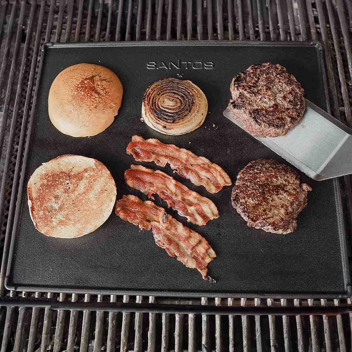 Nach dem Vorbild einer Plancha lassen sich eine Vielzahl von Gerichten zubereiten. Kleingeschnittenes Gemüse, Fischfilets, Nürnberger, Garnelen oder Grillkäse brutzeln absturzsicher und kleckerfrei auf der gusseisernen Platte. Selbst Spiegeleier, Bratkartoffeln und Eierkuchen sind mit der SANTOS Grillplatte jetzt auch auf Eurer heißgeliebten Grillstation möglich. Euer Grillgut bekommt dabei eine gleichmäßige Bräune und ausgeprägte Röstaromen.